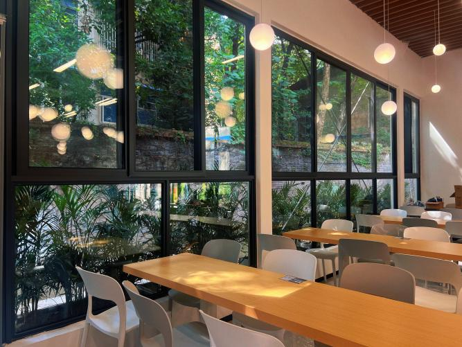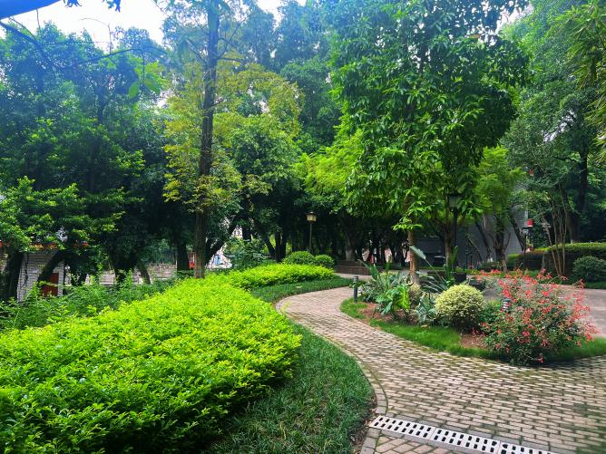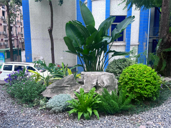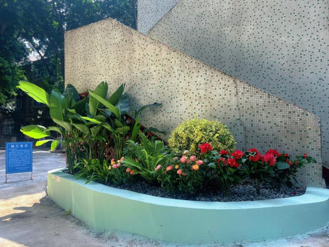 在教学楼、学生宿舍、食堂周边等重点区域,通过精心搭配月季、天堂鸟、太阳花、袖珍椰子等适应性强、观赏性高的植物品种,打造一个个既富有层次感又充满活力的绿化空间。