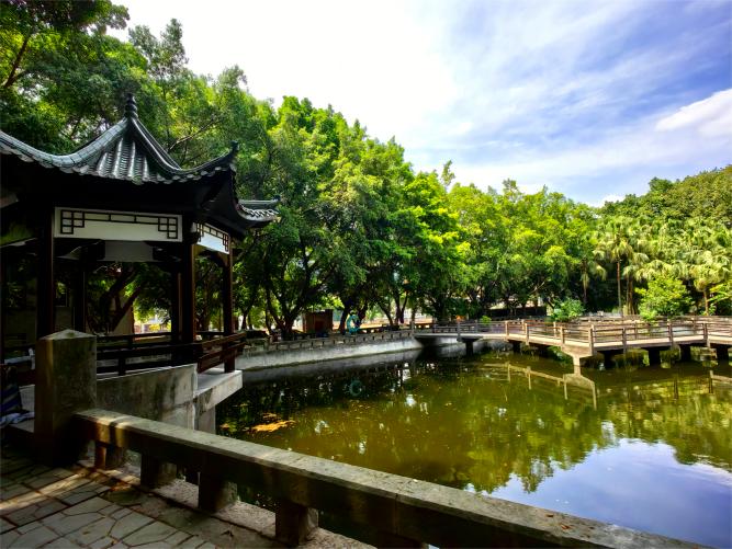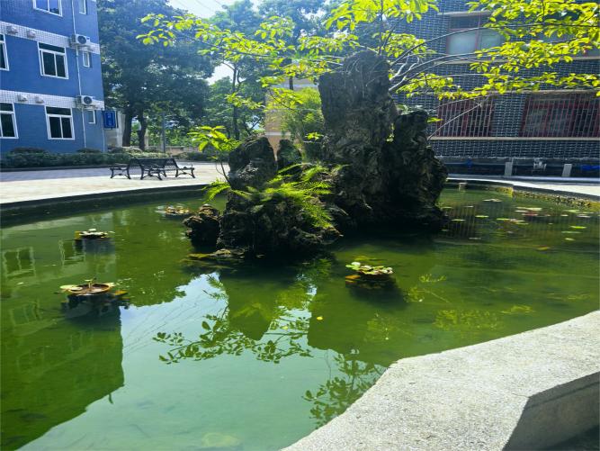 清理六角亭及假山杂草、水池清淤、蓄水,并种植睡莲等水生植物,丰富水体景观。