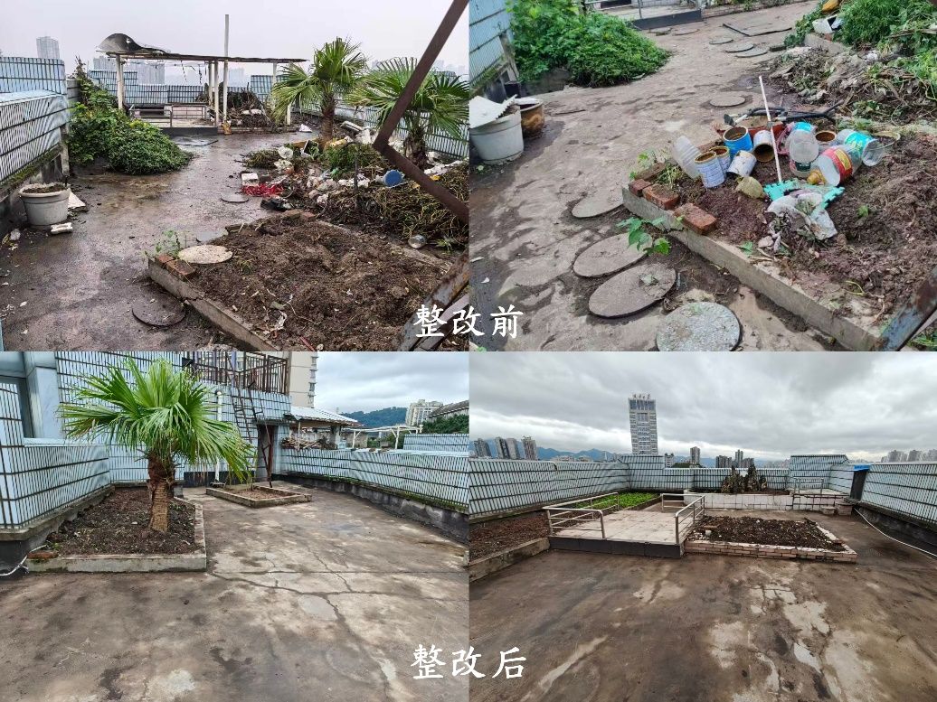在业主积极配合、主动完成前期清理的基础上,社区办协调专业施工队伍,对楼顶实施了系统整治:全面清运积存垃圾与杂物,彻底清除野藤杂草,疏通排水设施,并对相关区域进行规范化整理。经过集中整治,原本杂乱不堪的楼顶面貌焕然一新,环境变得整洁有序,各类安全隐患也得到了有效消除。
