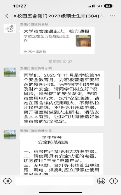 学生宿舍和教学楼是全校师生每日学习生活的重要场所,人员密集,消防安全直接与每位师生的生命财产安全和校园稳定息息相关,楼宇管理中心始终将消防安全工作作为首要任务狠抓落实,为持续筑牢学生宿舍与教学楼消防安全管理工作,提升学生及学生宿舍、教学楼工作人员消防安全意识与应对突发火情处置本领,楼宇管理中心联合保卫处、学生处在消防宣传月组织开展了消防安全宣传、违章电器检查等系列工作。