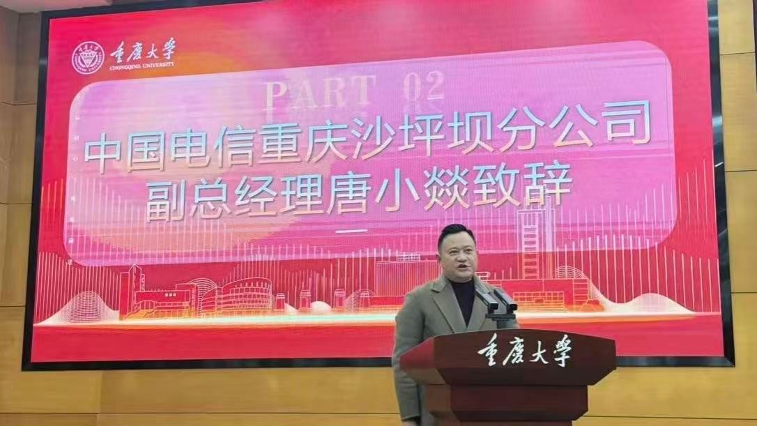 中国电信重庆沙坪坝分公司副总经理唐小燚致辞,他结合自身的工作经历,指出秉持“做好服务保障”的共同价值导向,是电信与后勤开展长期合作的基石。祝愿双方在新的一年,携手共进,探索校企合作新模式。
