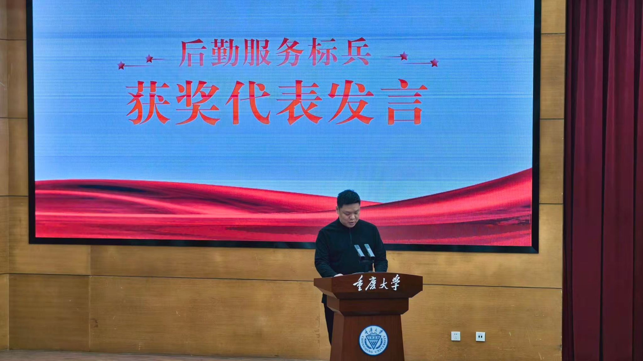 邱荣富、徐宋兵、唐小燚为10名“后勤服务标兵”进行颁奖。获奖代表田川、万颖分别进行发言。